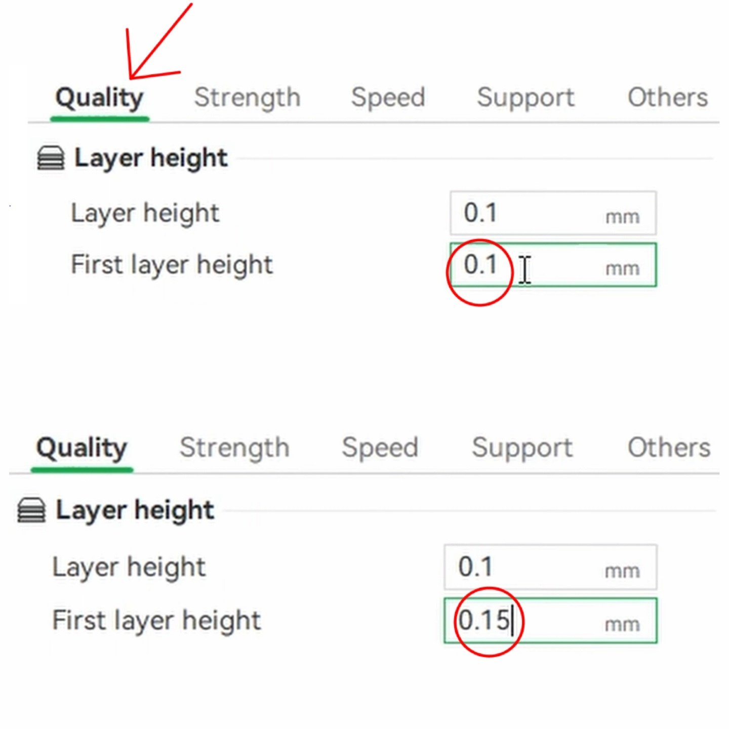 الذهاب الى قائمة Quality وتغيير First layer hight من 0.1 الى 0.15