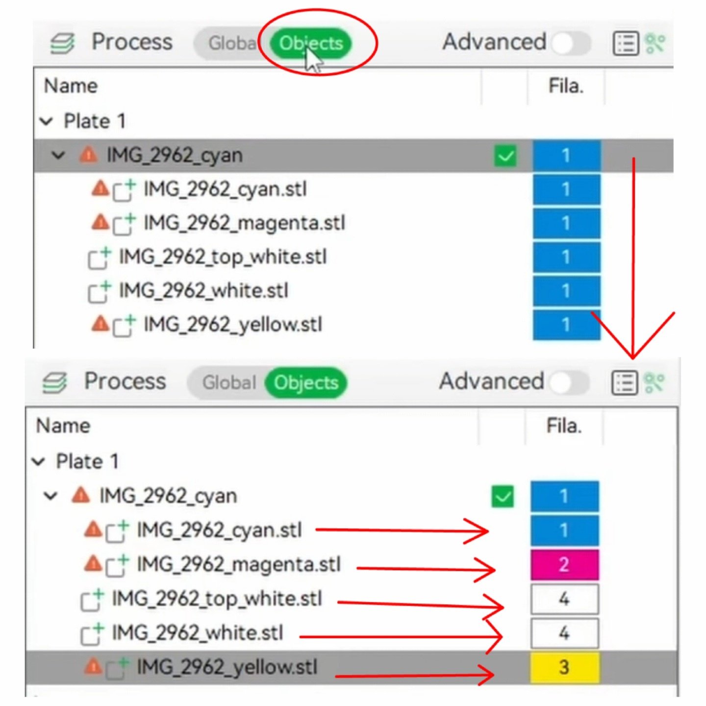 نأتي الى قائمة Objects و نغير لون كل جزء من الصورة حسب اسمه