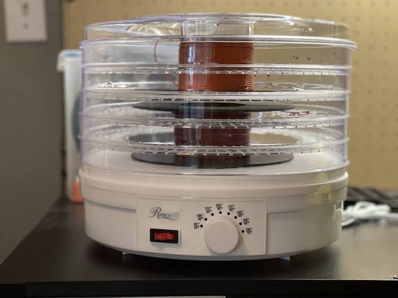 • التجفيف باستخدام طابعة ثلاثية الابعاد: هنلك بعض الطابعات التي تقدم هذه الميزة, و ايضا يمكن تجفيف الخيوط باستخدام اي طابعة وذلك باحماء سرير الطابعة الى درجة حرارة ( 50 درجة مئوية) ووضع البكرة على السرير, بعدها يتم تغطية البكرة باي صندوق مع ترك فتحة صغيرة لعدم حبس الحرارة و ذلك سيتلف البكرة.
